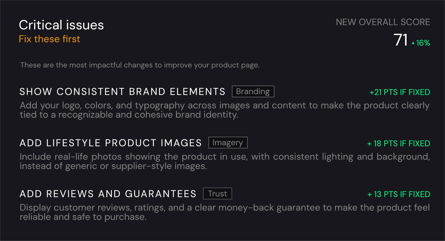 Get clear, prioritized actions to improve your Shopify product pages and increase performance.